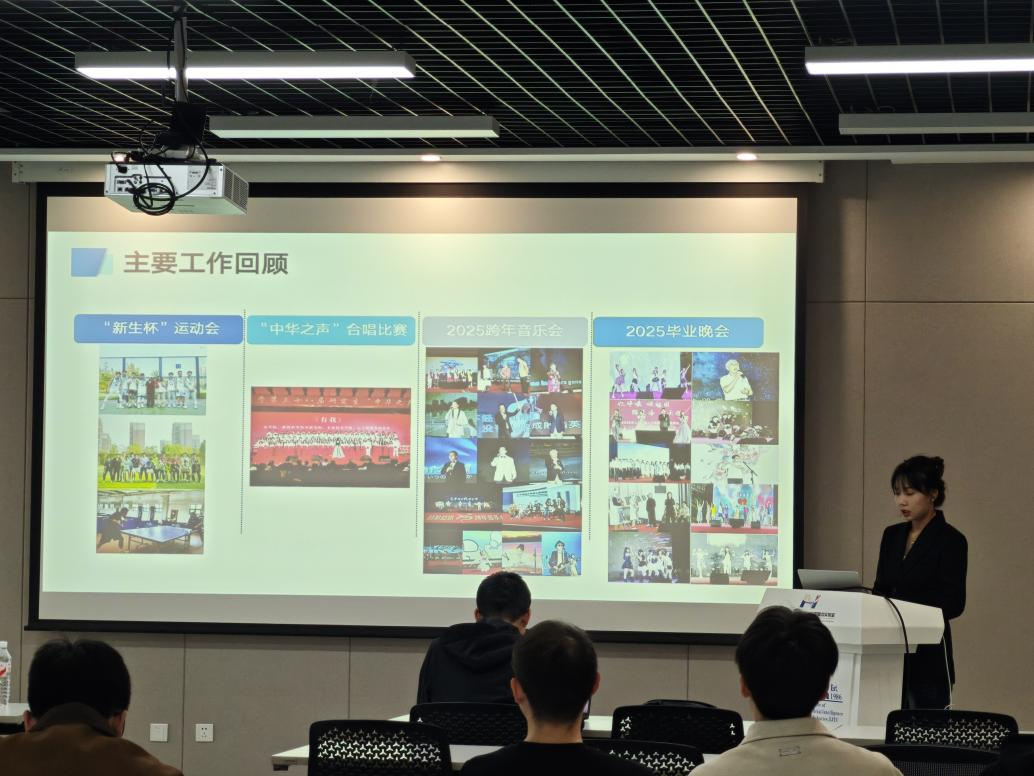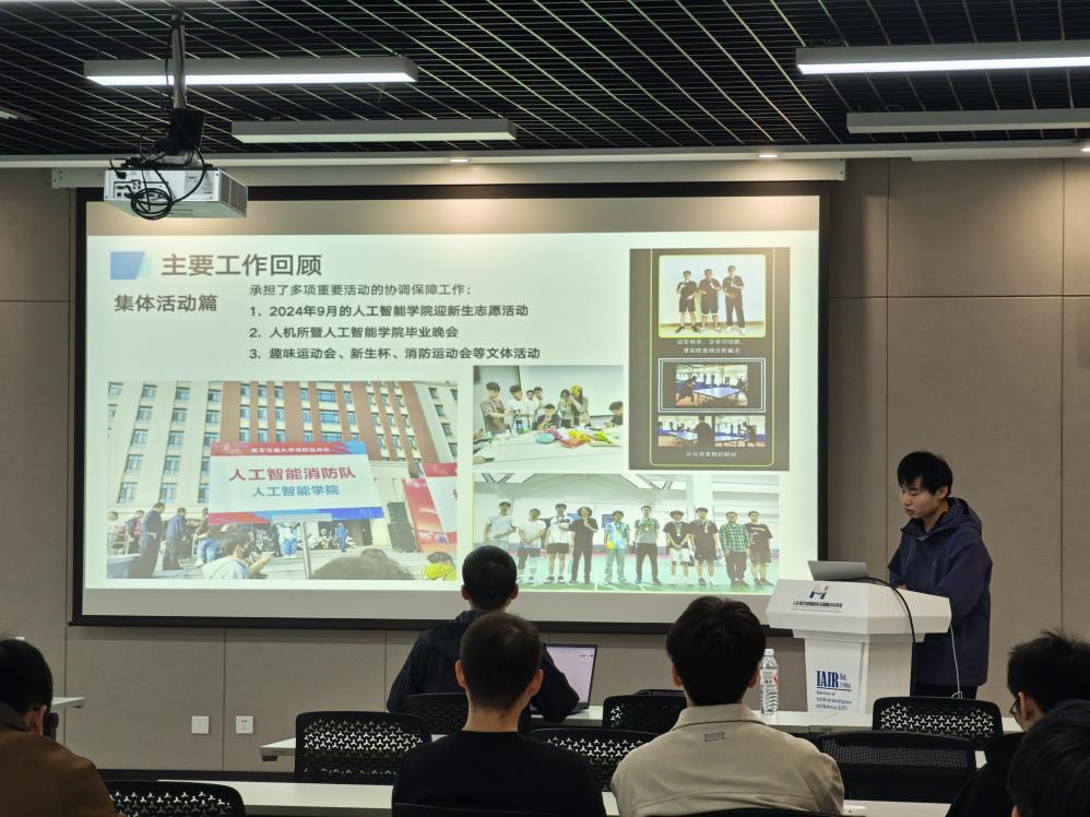 常务中心主席团成员陆宇恒简单介绍了常务部门结构和职能,认为常务部门是研究生会的“中枢神经”与“坚实后盾”,同时回顾了前一年的主要工作,并进行了问题反思,认为内部沟通效率有待提升,工作简报形式可更生动。