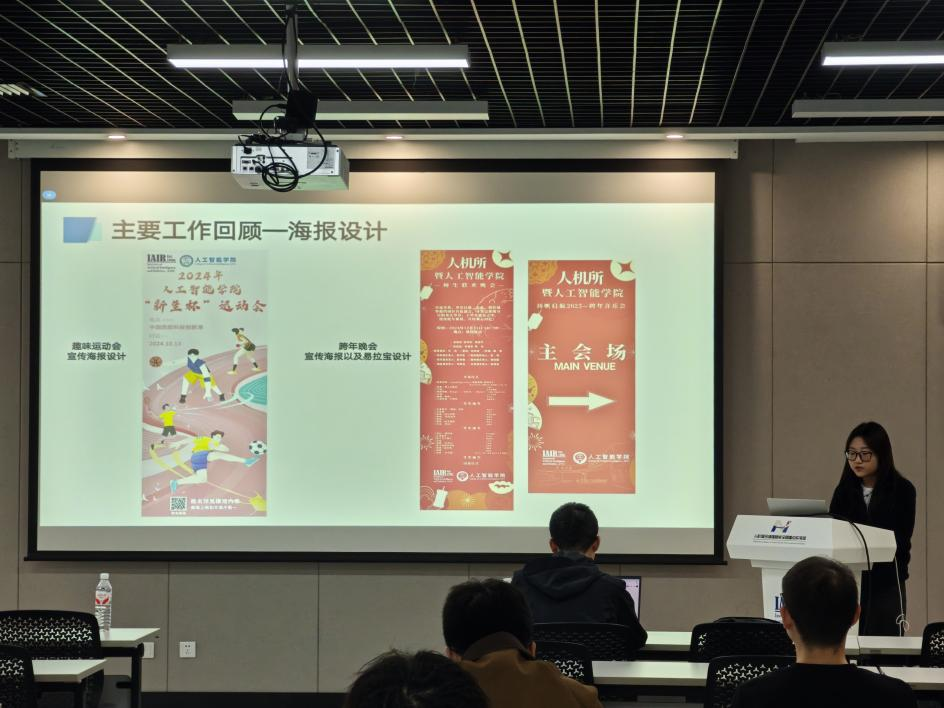 宣传中心主席团成员李佳怡简单介绍了宣传部门结构和职能,宣传部门主要工作包括通知撰写,推送排版,海报设计以及摄影工作等等,同时李佳怡指出工作流程与协同方面,内容质量与创新方面仍然需要改进,最后也期望在未来的一年里,宣传部门能够建立更健全的制度,并完善资源库建设。